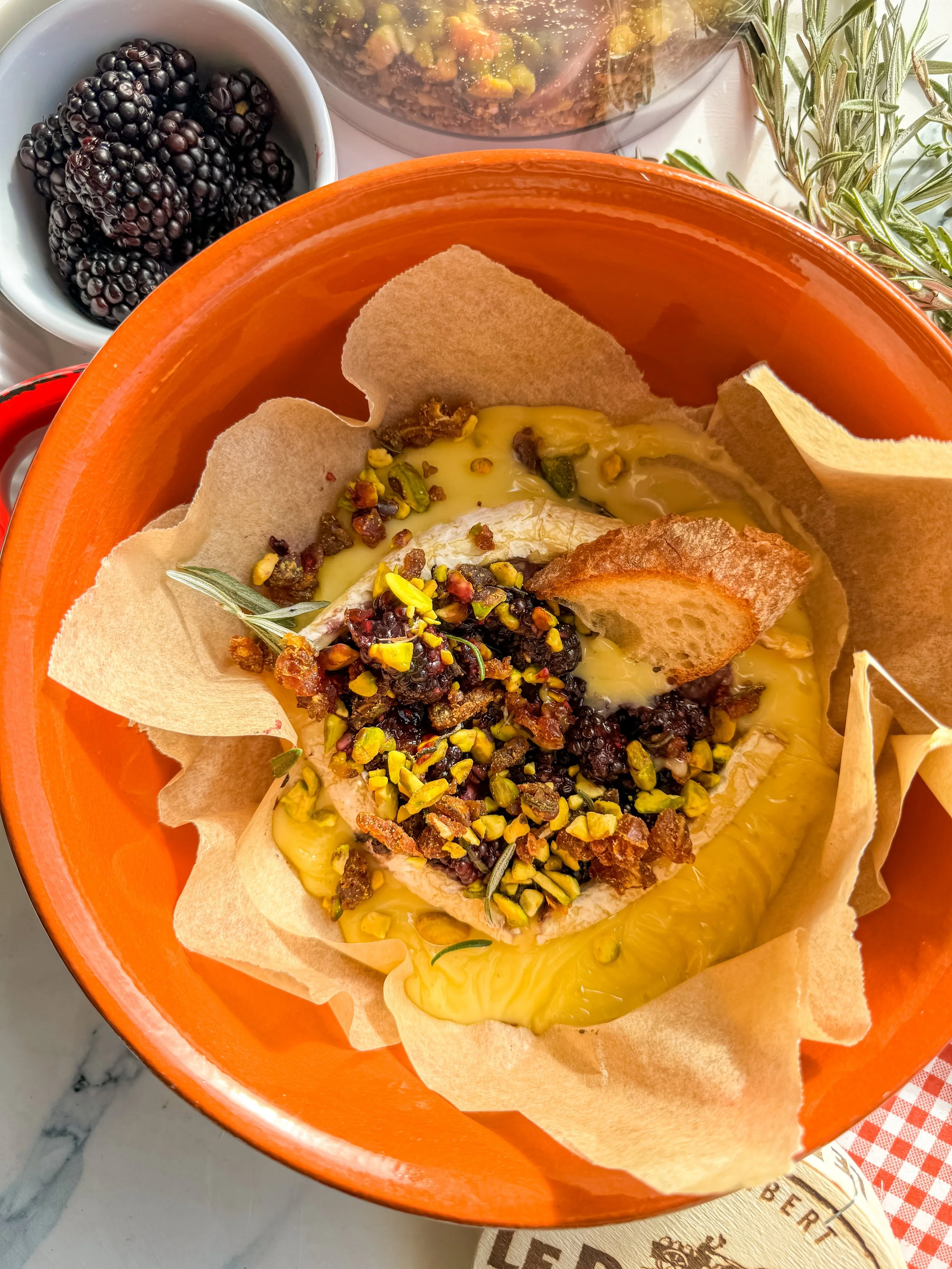 If you’re in search of an easy appetizer, this is a perfect go-to! A very low effort, but elegant-looking fix that can be made any time of year. It’s especially perfect around the holidays as a warm comfort food. There’s gooey cheese, tart berries, crunchy pistachios, and even more flavors packed in a mere handful of ingredients. Serve hot with toasted sourdough, fresh berries, raw honey, and your other favorite appetizers!