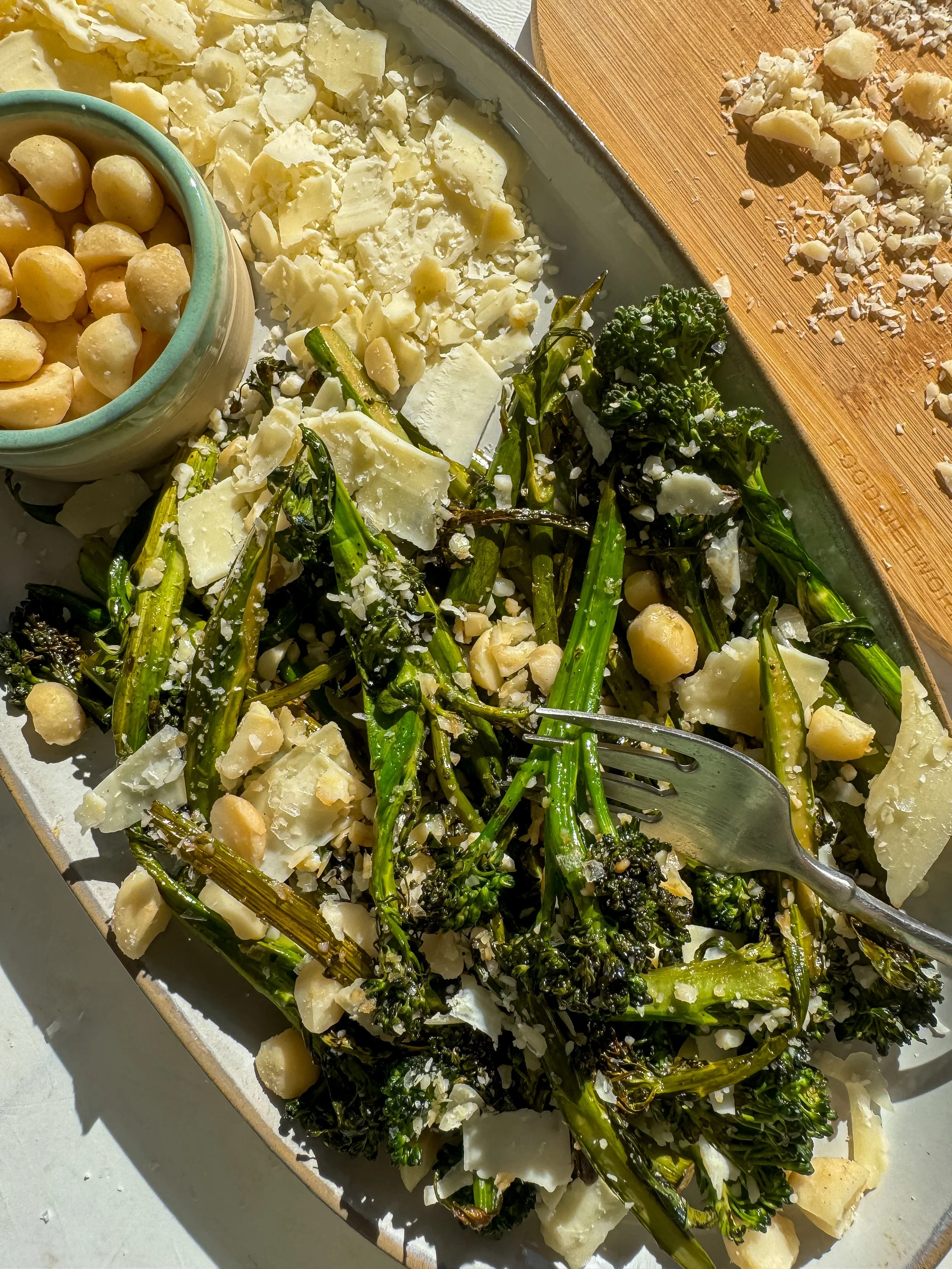 Transfer to a serving dish. Sprinkle with parm, macadamia nuts, and a generous pinch of flakey sea salt. Enjoy!