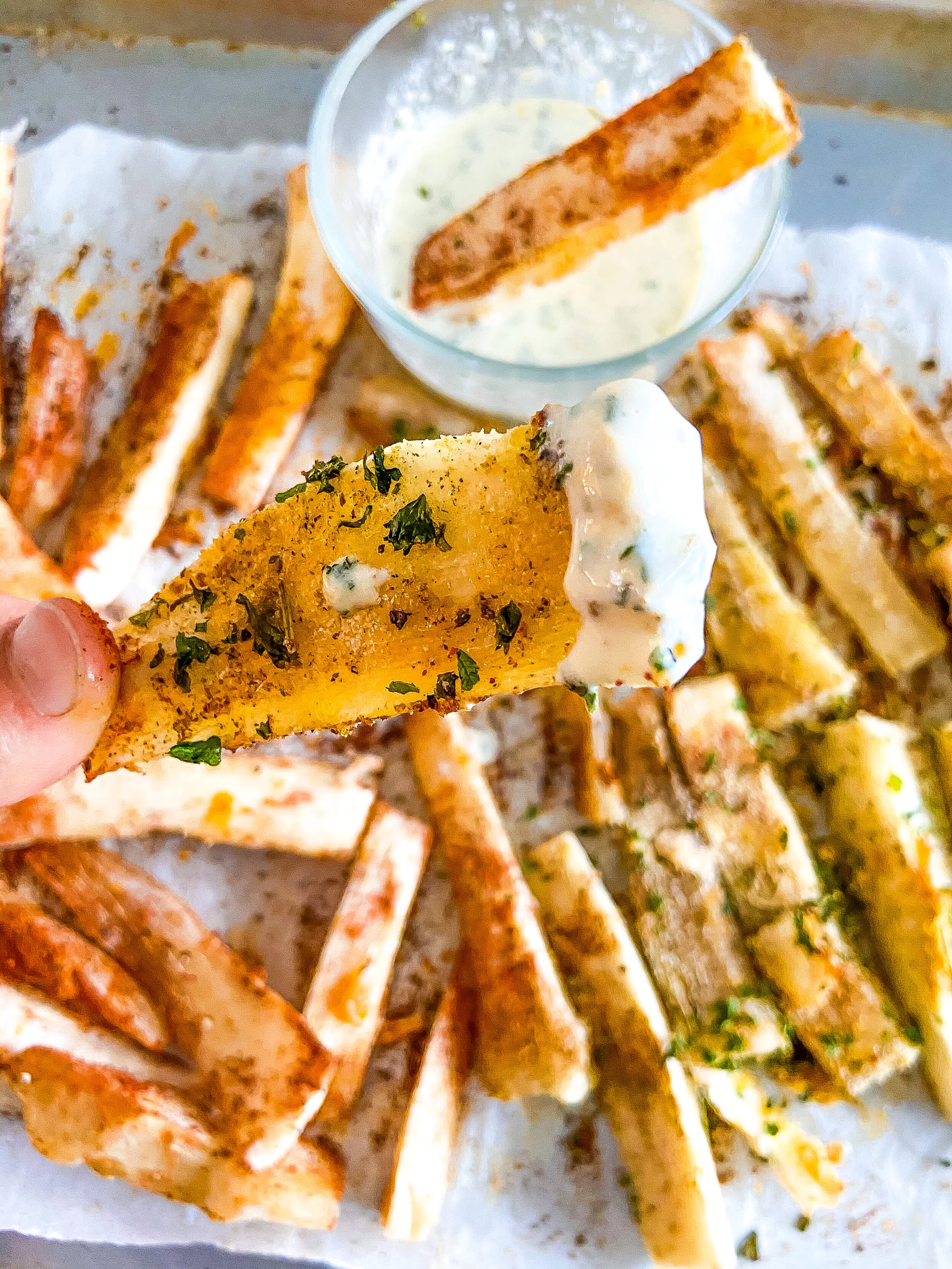 What’s a yuca root, you ask? It’s the edible root of a leafy, cassava plant. After a bit of preparation, they are transformed into a healthy, grain-free alternative to french fries! They have an extra starchy taste, which makes them ideal for my easy, creamy ranch. This crispy, flavorful side dish is friends and family approved! They are even easily customizable with whatever seasonings you chose. Truth is, I haven’t bought fries since I started making these from home regularly!