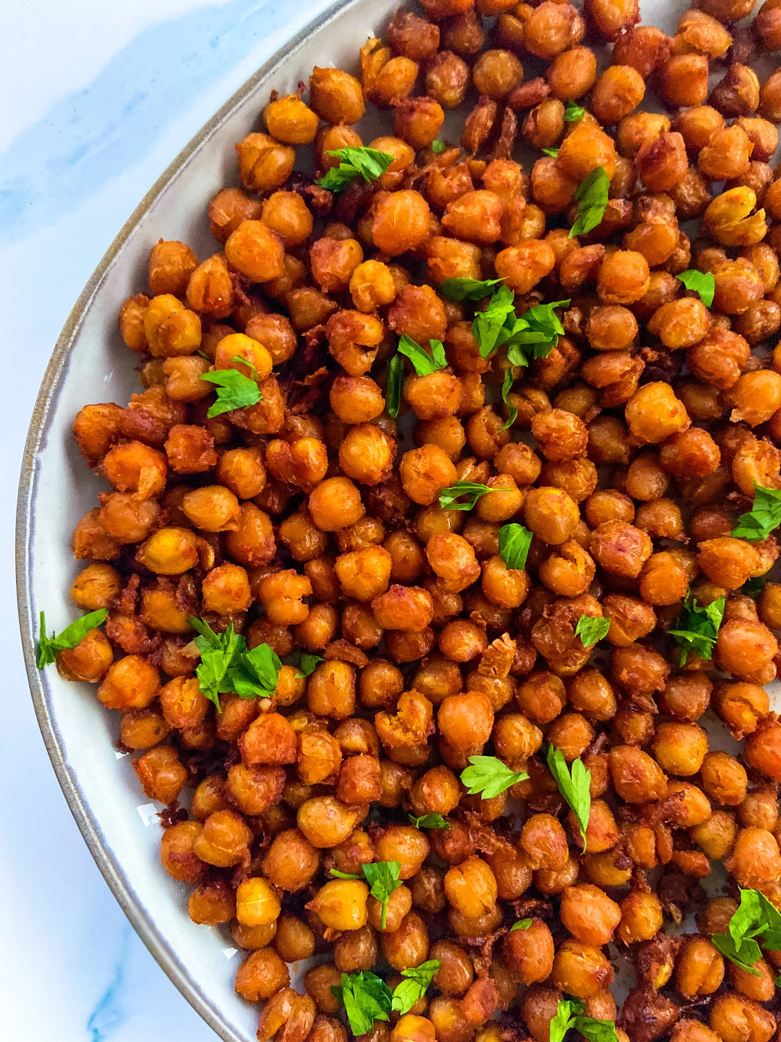 Move the pan to the oven and let them cook for 45 minutes, moving them around about halfway through. For crisper and crunchier chickpeas, cook for another 10 minutes or broil them for 2 minutes on 500°F.