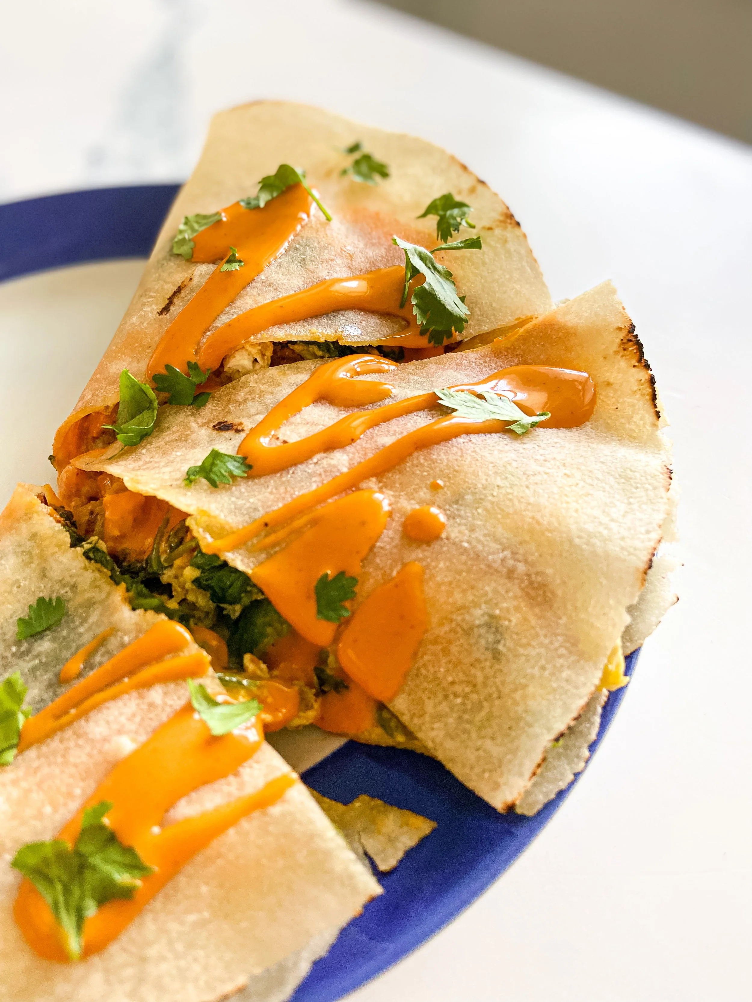 Warm your tortillas as desired (I love doing this over an open flame — it only takes about 10 seconds per side). Transfer the food in the skillet to one tortilla laid flat. Add some avocado slices, if desired, fresh cilantro, then top it all off with the other tortilla. Slice your quesadilla, drizzle with extra buffalo sauce if you’re feeling it, and enjoy!
