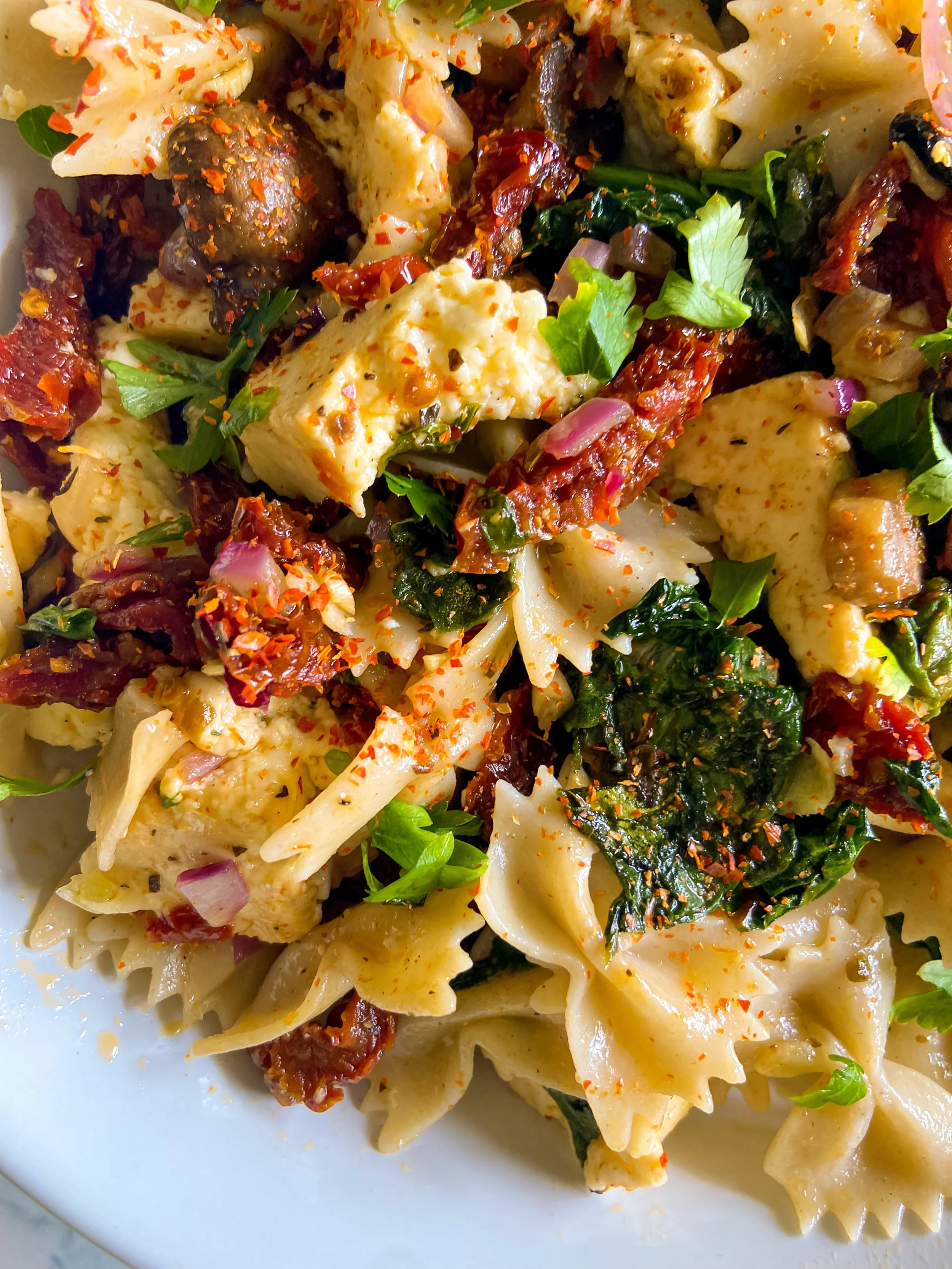 I finally hopped on the baked feta pasta trend, and feel inclined to make up for lost time! I knew the premise of the trend, and decided to make it my own with gluten-free pasta, sundried instead of cherry tomatoes, and a few more twists! This 20-minute meal is hearty, flavorful, and perfect for the whole family. Enjoy this cozy meal chilled or right out of the oven any time of year you choose!