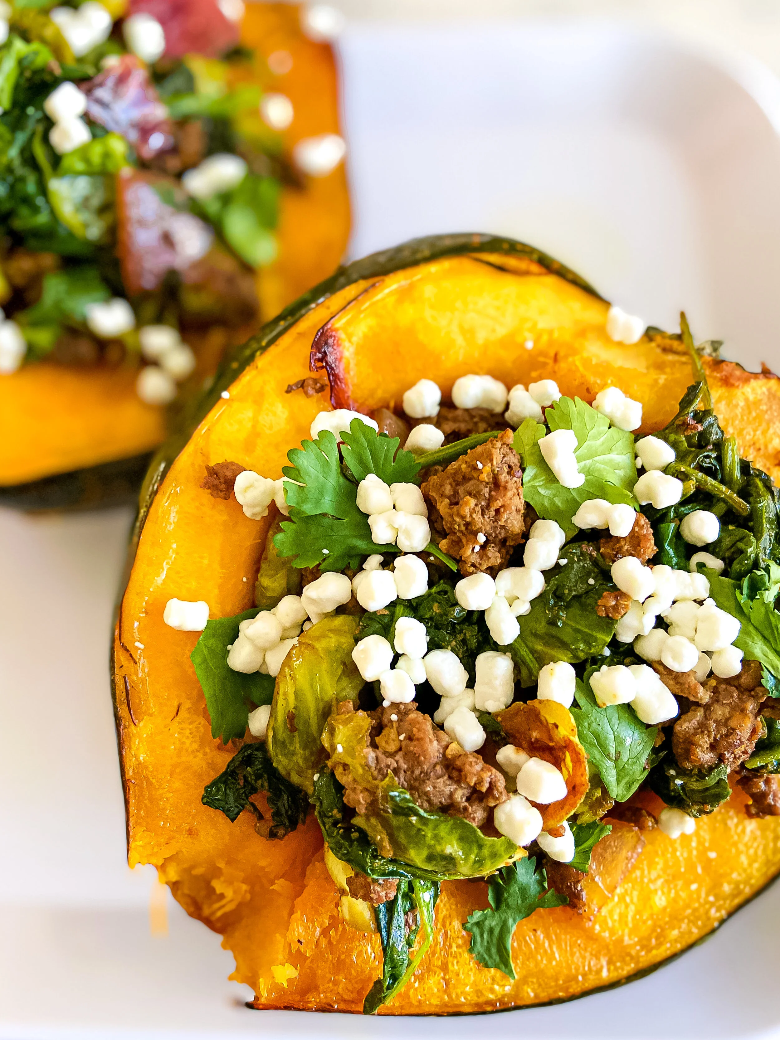 I am totally aware that pumpkin usually steals the squash spotlight, but I thought it was only right to give acorn ones a chance at the table. Each half tastes and shreds into “noodles,” just like spaghetti squash, including the one here. It is oh so easy to take this simple, seasonal item up a few notches, to a hearty meal for the whole family to enjoy! They can be stuffed with any sauces, veggies, truly whatever your taste buds are craving. However, quickly learned that juicy sausage, fresh sage, and sweet balsamic vinegar is a great place to start, along with a few more vegetables + spices you may already have on hand!
