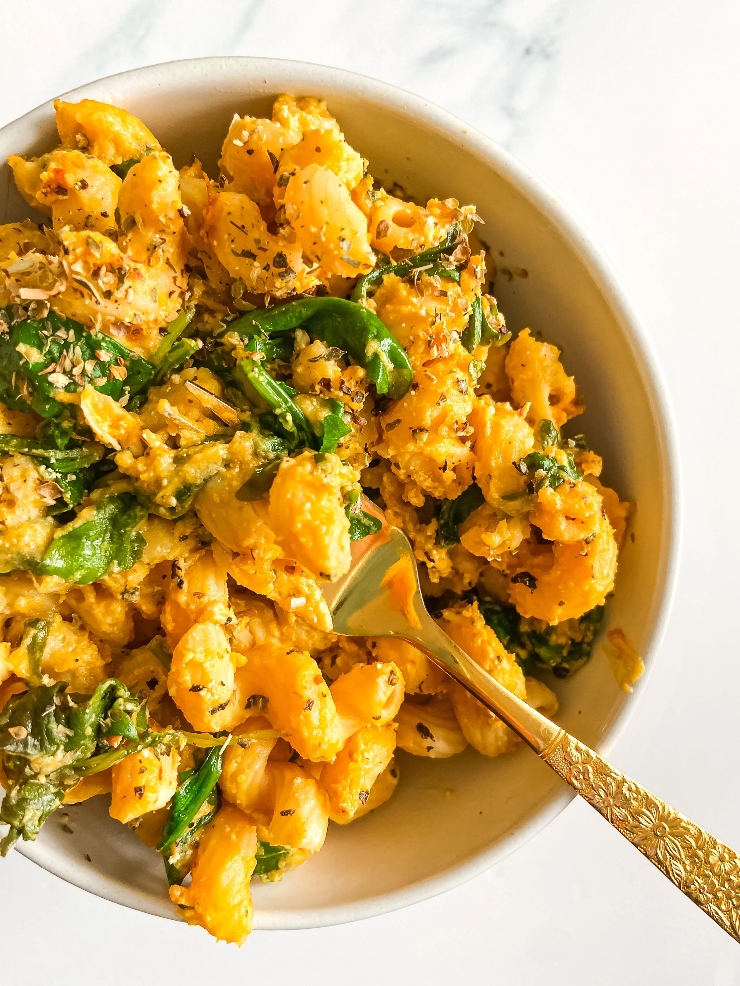 Fall-inspired alfredo or mac n’ cheese, who’s to say? The not-so-secret addition of pumpkin purée is tasteless, yet crucial to creating an extra creamy, hearty texture for the sauce. It takes all of five minutes to make and likely around the same time to eat, once the first forkful is gone! My family, along with yours, will love having it melt in our mouths and served on repeat. This could not be a simpler, yet fresh + flavorful part of any pasta dish, pizza, or even casserole, enjoy!