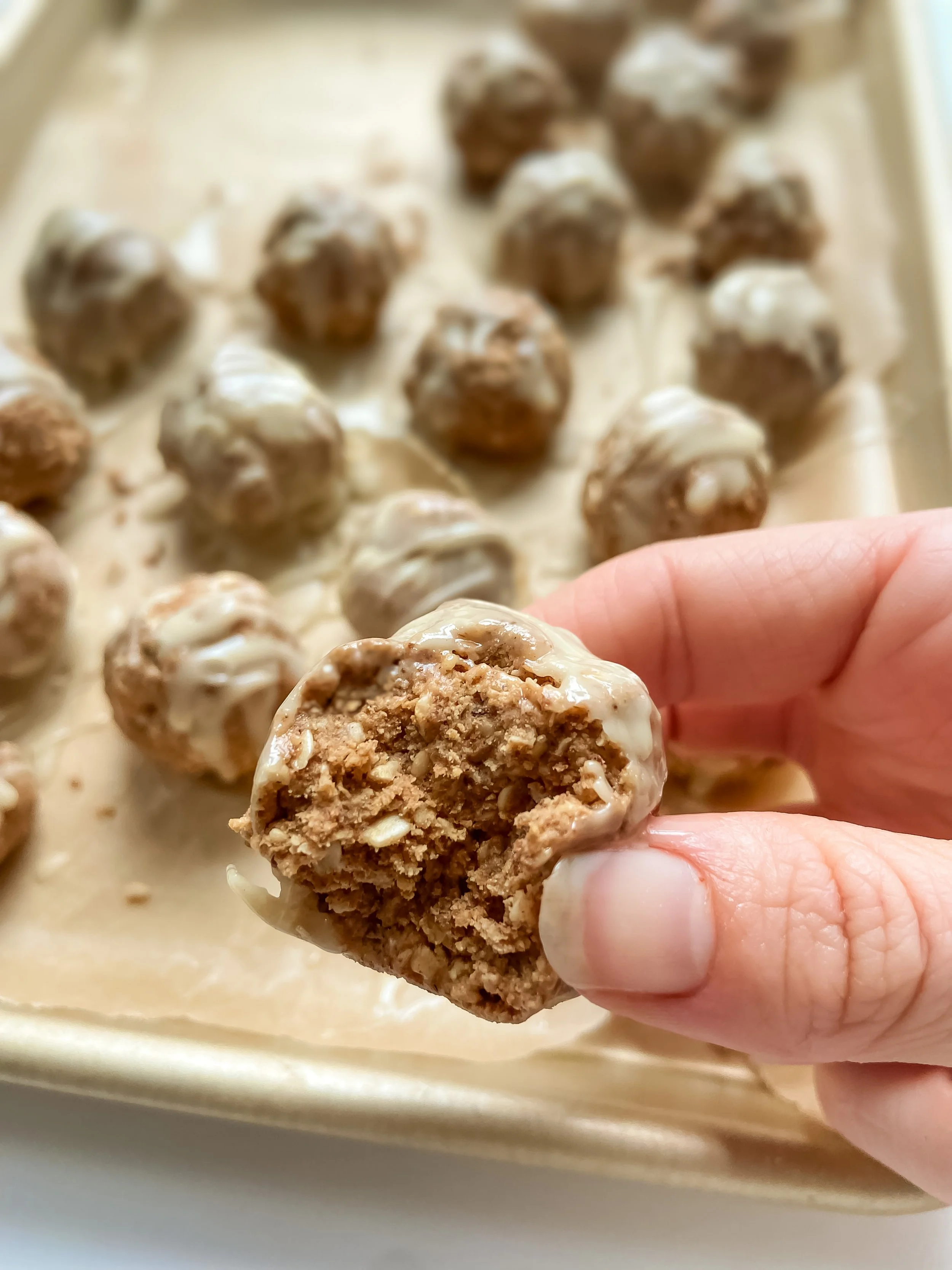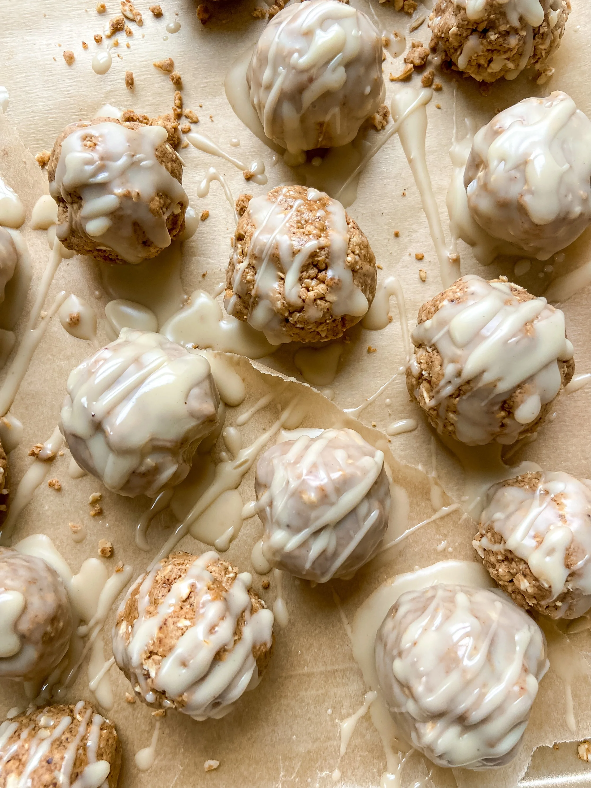 Once the balls have chilled, douse and/or drizzle them in the icing. Place them back in the freezer for a final 5 minutes. Here, double-dipping/drizzling is highly encouraged (the icing will now freeze almost immediately)!