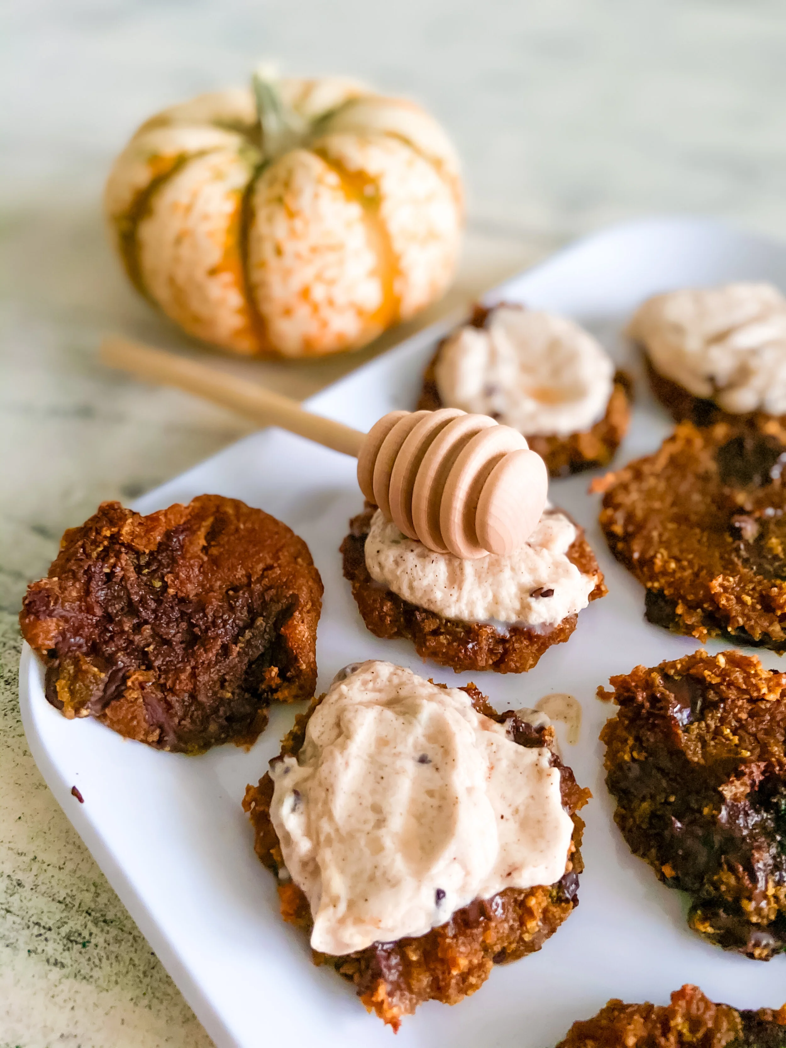 Each batch irresistibly fills the house of the common, cozy pumpkin taste and oozes with bittersweet chocolate. The optional (but not really) “cream cheese” frosting is made up of just four ingredients in almost no time. They pair so well together and leave the sweetest, most satisfying fall flavors behind. Nothing like having freshly baked cookies on hand, even for a short period of time! Personally, I find them extra special, when baked from scratch and free from all the unnecessary add-ins. Might as well go ahead and double the batch because, if you are anything like my family, these will not last even a few days!