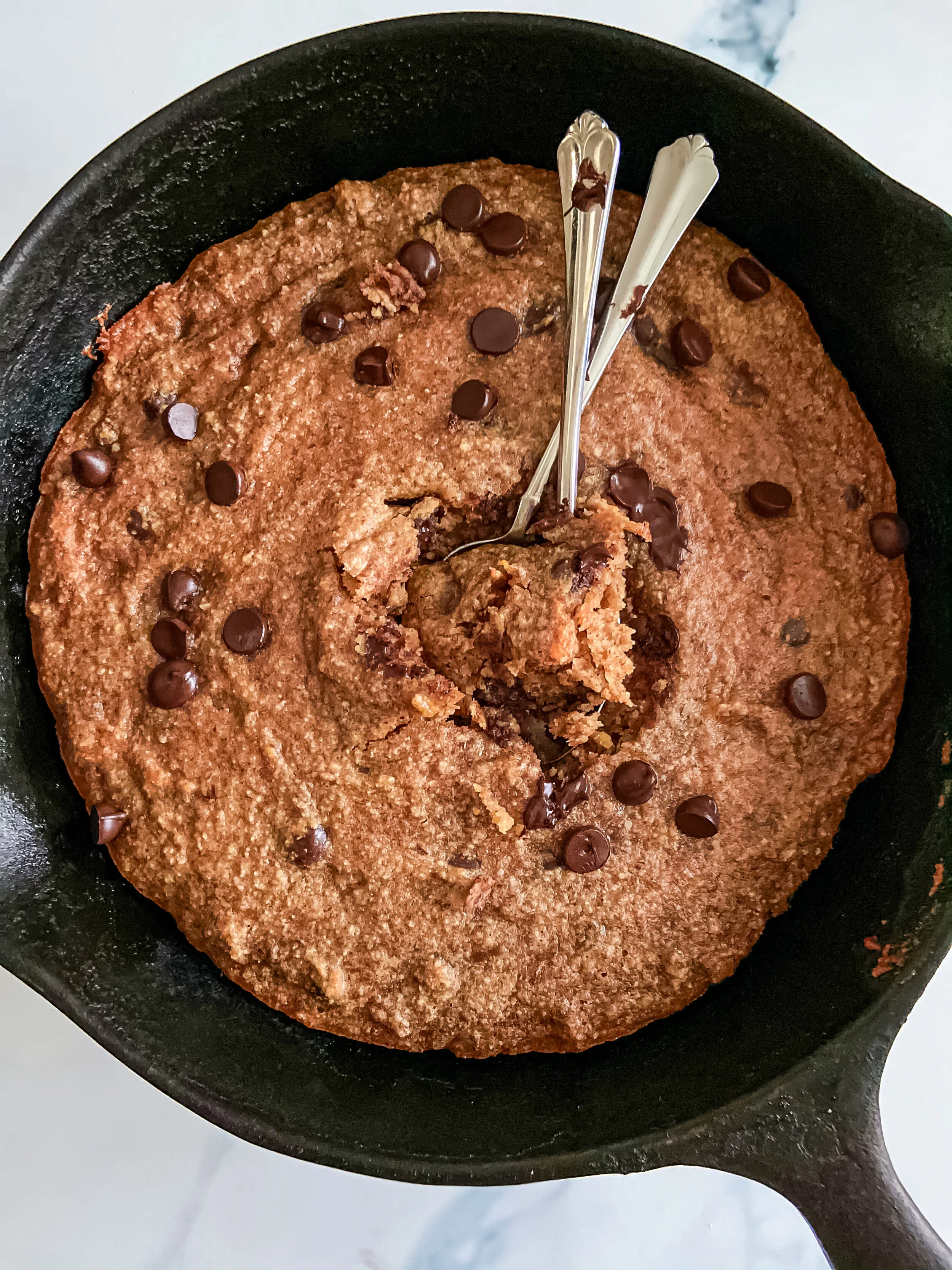 To double the recipe (which I highly recommend!), simply follow the same directions, though doubling all of the ingredients, and transfer to batter into a 13-inch cast-iron instead! The oven time may very, so I recommend sticking and knife in the center until it comes out clean, to see when the baking is complete.