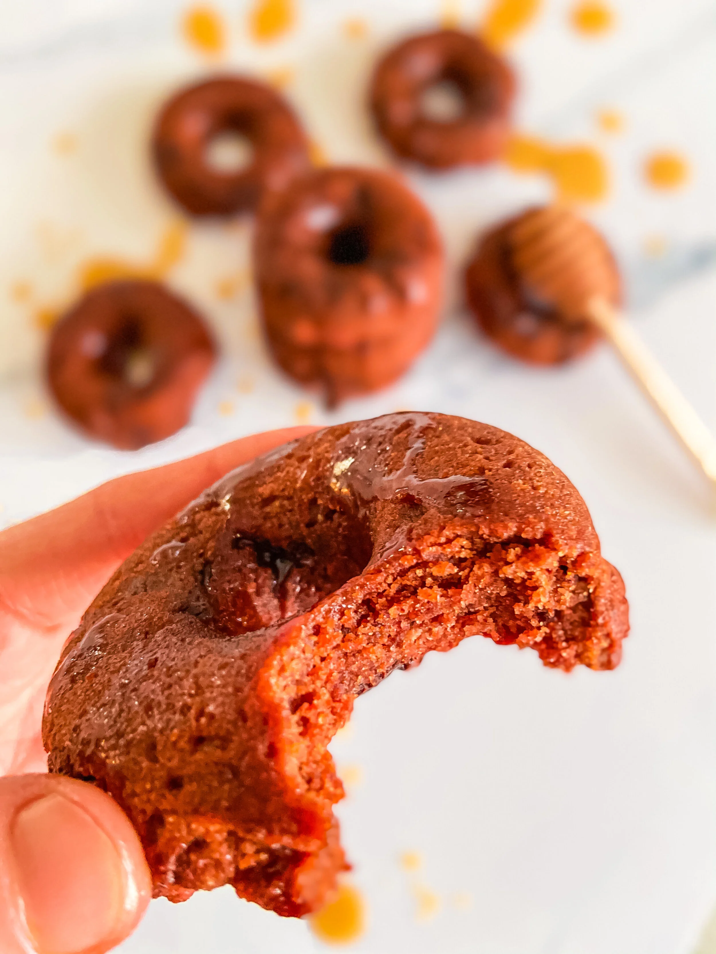 Remove the glaze from the fridge/freezer and stir well, once again. Grab a spoon or honey dipper to drizzle the glaze overtop of each freshly-baked donut. Use leftovers, if any, for dipping + dunking!