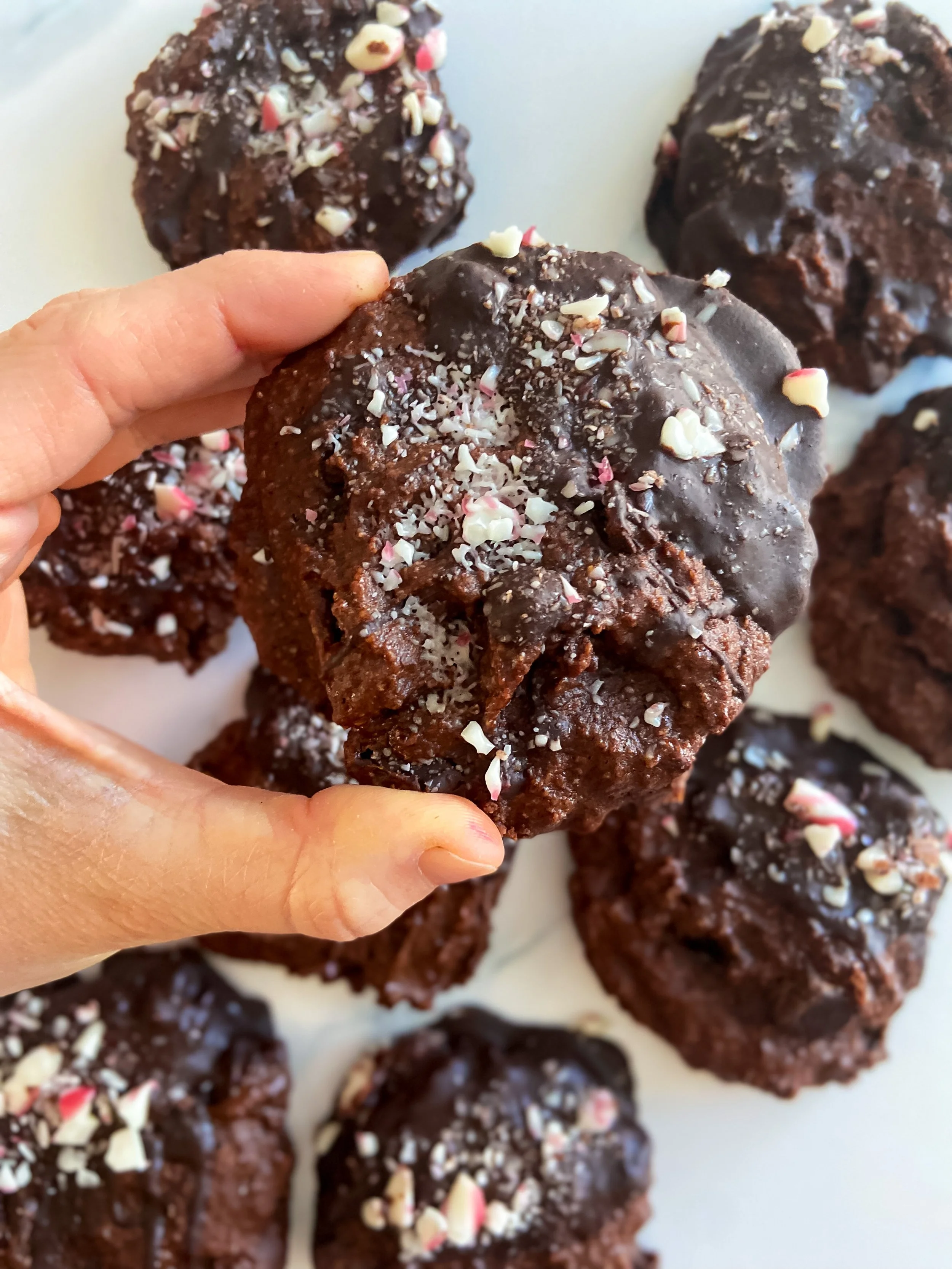 Gluten, dairy, and grain free cookies coming in hot! This rich treat has bittersweet chocolate in three forms, and a crunchy edge of festive candy canes. They’re made for the holiday season, but can truly be enjoyed any time of the year. Besides, I doubt I could wait until the holidays to enjoy these all over again! They blend the beloved textures of fudgy and smooth. Make a batch (or two) for a Christmas party, cozy movie night, or to have as a sweet pick-me-up throughout the week!